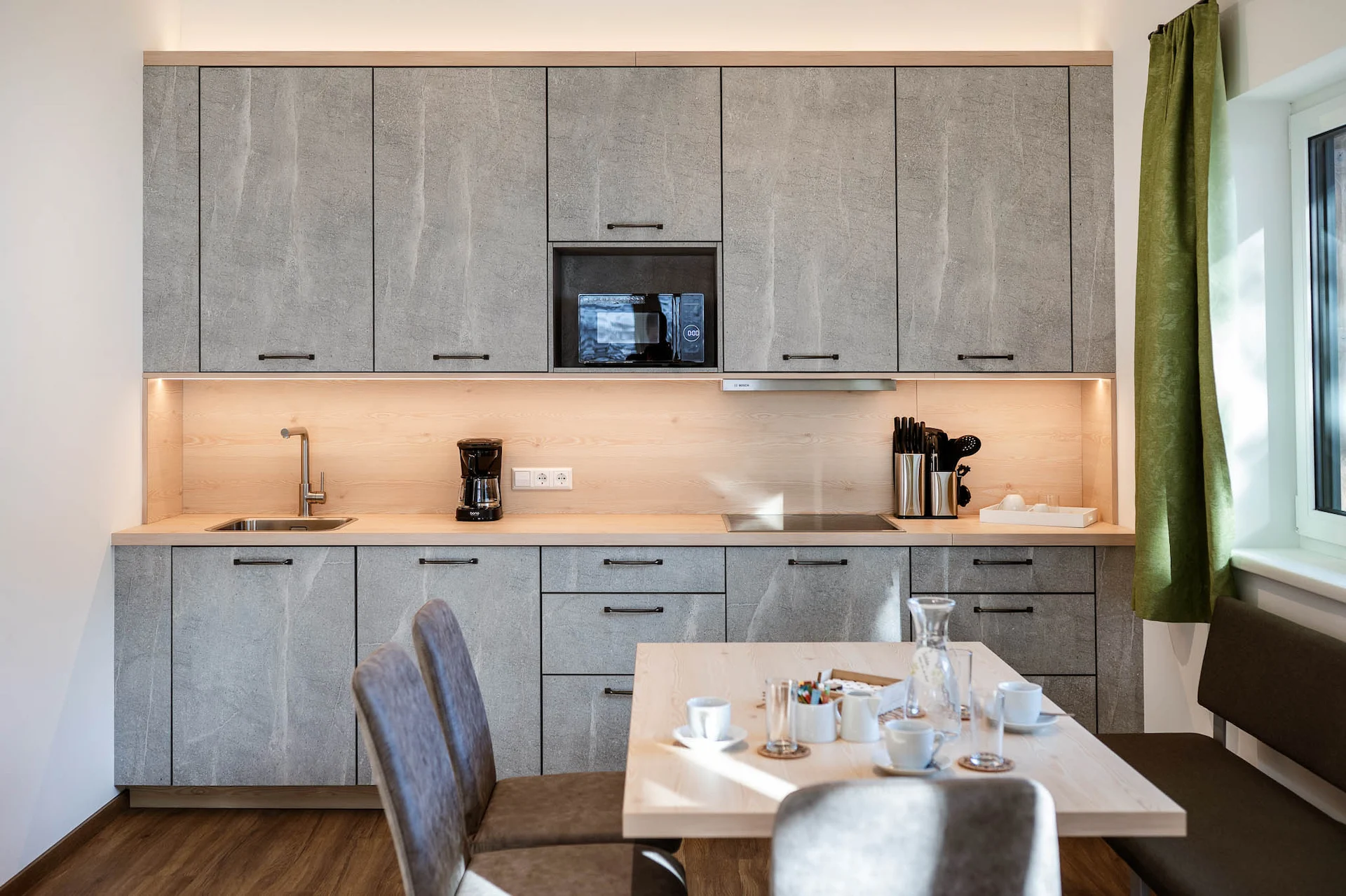 Die voll ausgestattete Wohnküche verfügt über Herd, Geschirrspüler, Grillmikrowelle, Toaster sowie Kapsel- und Filterkaffeemaschine. Am großen Esstisch könnt Ihr gemeinsame Mahlzeiten, Spieleabende oder gemütliche Gespräche genießen.